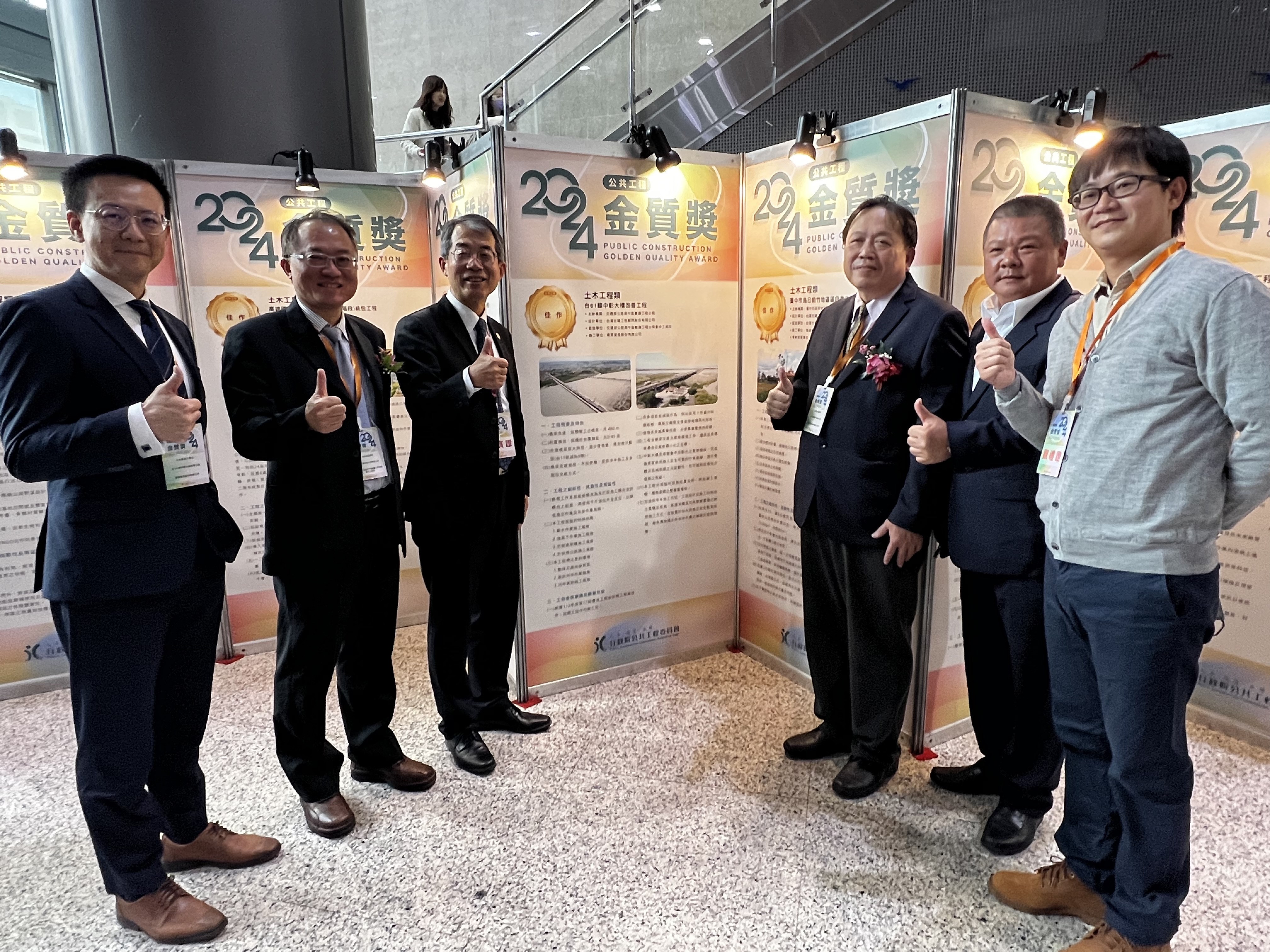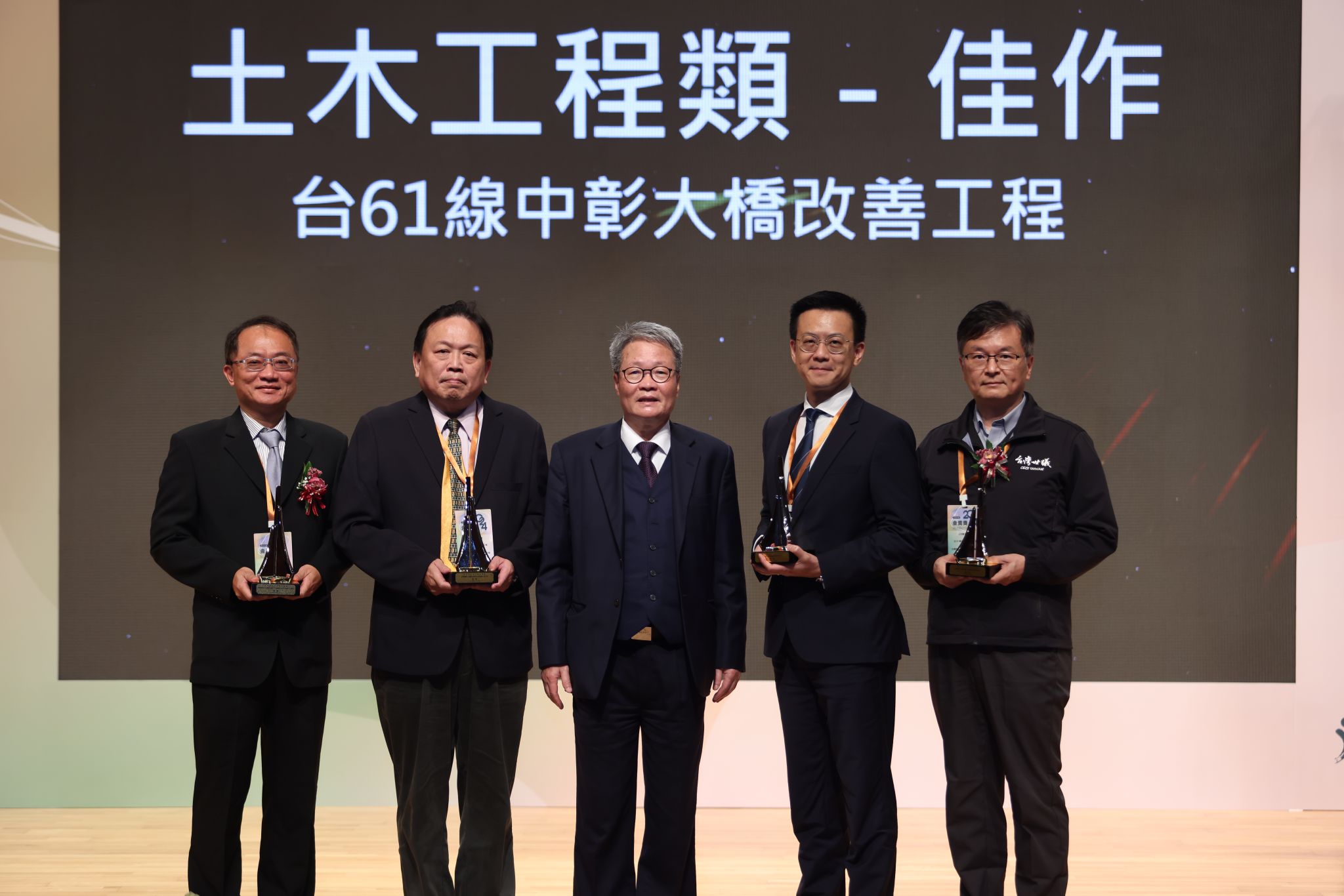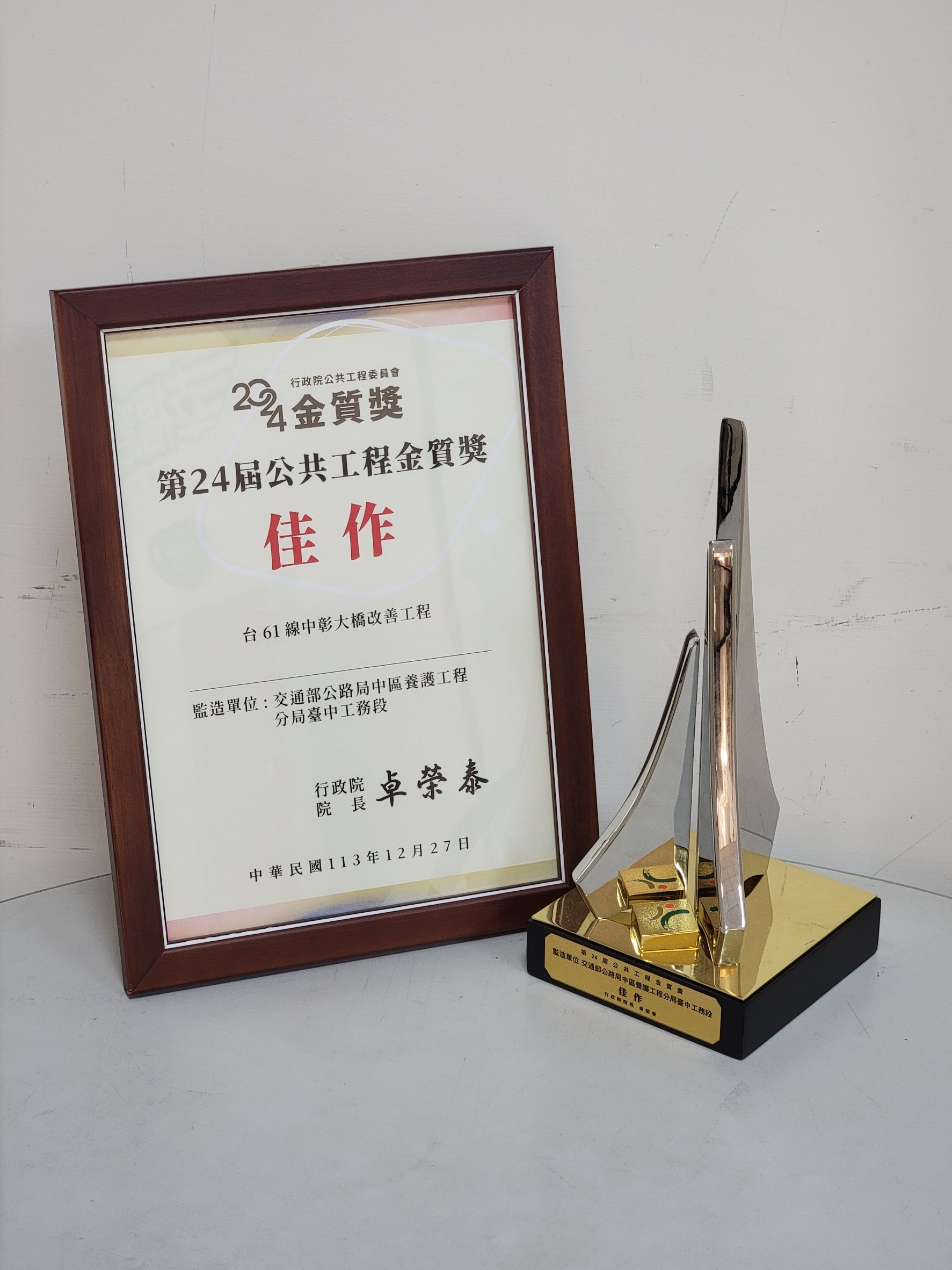 本分局主辦「台61線中彰大橋改善工程」榮獲行政院公共工程委員會第24屆「公共工程金質獎」土木工程類第一級(契約金額10億以上)「佳作」殊榮。113年12月27日由行政院公共工程委員會舉辦金質獎頒獎典禮,本局由陳局長文瑞率隊參加,並由本分局謝分局長俊雄、臺中工務段陳段長俊彰、台灣世曦工程顧問股份有限公司彭協理知行、春原營造股份有限公司蔡董事長宗憲上台代表受獎。